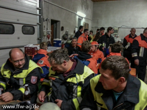 Nach dem Einsatz wurde in einer Halle der Familie Schwarz die Übung kurz bei einer Brotzeit besprochen.